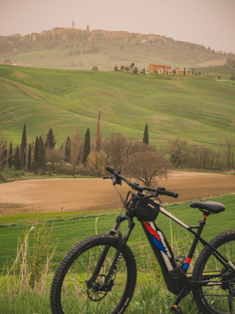 Ik vond het fietsen in Toscane echt fantastisch en het stond al heel lang op mijn to-do lijstje. Wat een prachtige regio is het! Maar ik merkte wel dat ik de heuvels van Toscane zwaar had onderschat, en ook de kracht van de elektrische fiets. Ik dacht, die doe ik als fietsende Nederlander wel even, hoe moeilijk kan het zijn? Nou, moeilijk dus. Nu had ik dus het weer niet mee, maar de heuvels waren wel echt pittig. Volgens mijn route app heb ik meerdere keren 400m moeten klimmen. Kijkend naar de eerste foto, ligt Montepulciano inderdaad ook op een flinke heuvel. Dat kostte meer moeite en tijd dan ik had ingeschat, en ik was dus slecht voorbereid met veel te weinig power food. Ik had overal spierpijn de dag erna en heb me ’s avonds volgepropt met elektrolyten, eiwitten en magnesium om weer een beetje tot leven te komen.
