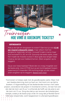 In deze trein reis gids vind je de inspiratie voor de route en basisinformatie, zoals reistijd, treinkosten, informatie over de Duitse treinen en waar je de tickets boekt en wat basisinformatie over de verschillende stops. De gids is bedoeld voor degenen die graag zelf hun reizen plannen, maar vooral erg overweldigd zijn door de hoeveelheid keuze met treinreizen.