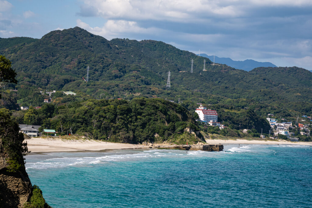 At the suggestion of a friend, I embarked on my first solo adventure and took the train to a far-flung destination from Tokyo. After my first Shinkansen experience to Atami, I hopped on a local train that traveled along the scenic coastline to Shimoda. The journey fell in early fall, with colorful forests on one side and quaint fishing villages and stunning views of the Pacific Ocean on the other. Swinging through tunnels and past cliffs, the train took me in just over two hours to Shimoda, an idyllic coastal town at the end of the Izu Peninsula, perfect for a “sun, surf, and sand” getaway.